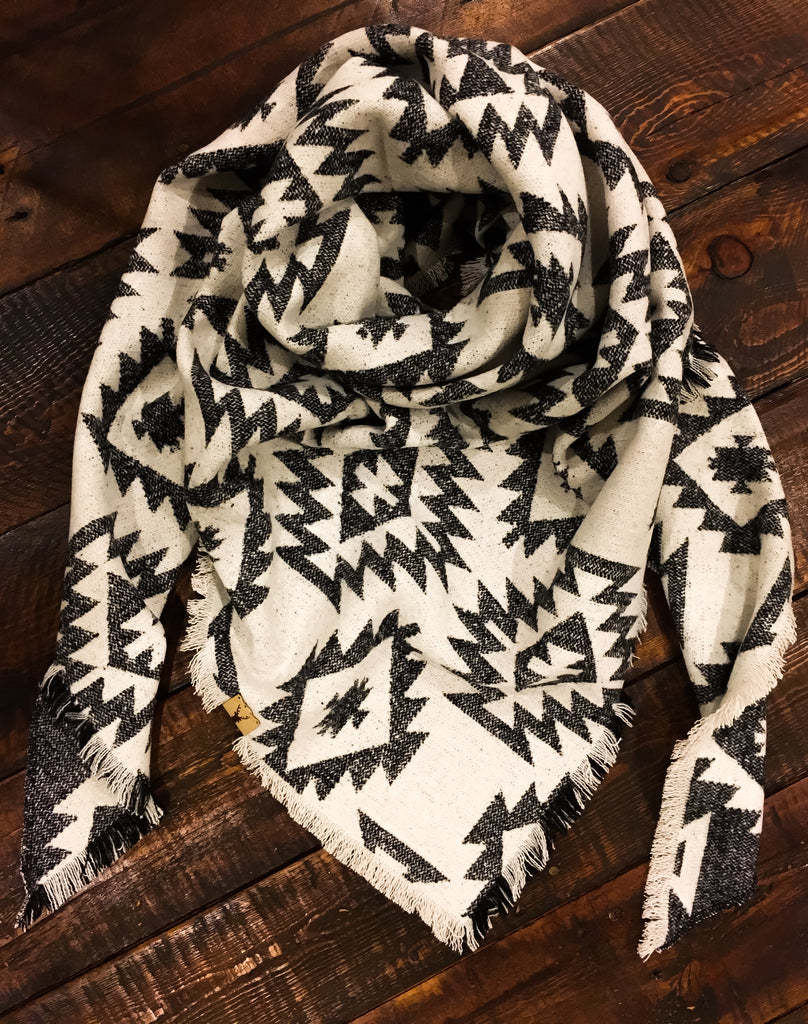 Soft wool blend black and white aztec triangular shawl with fringe. Classic monochrome colours with an aztec flare.SPU:ACCJ25111705Material: 20% Wool, 80% PolyesterSize: 58X58X80